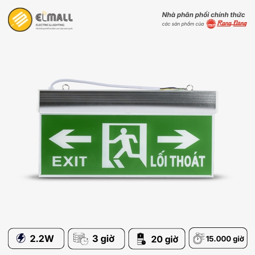 Đèn LED Chỉ Dẫn 2.2W 2 Mặt CD01 40×20 là mẫu đèn exit thoát hiểm của Rạng Đông, thiết kế hiển thị 2 mặt với kích thước bảng chỉ dẫn 40×20 cm. Sản phẩm tiết kiệm đến 75% điện năng so với đèn huỳnh quang truyền thống, tuổi thọ đạt 15.000 giờ và thời gian khởi động dưới 0,5 giây. Pin sạc dung lượng 800 mAh duy trì chiếu sáng dự phòng 3 giờ khi mất điện, đáp ứng tiêu chuẩn TCVN 7722-1:2009 và IEC 60598-1:2008.
